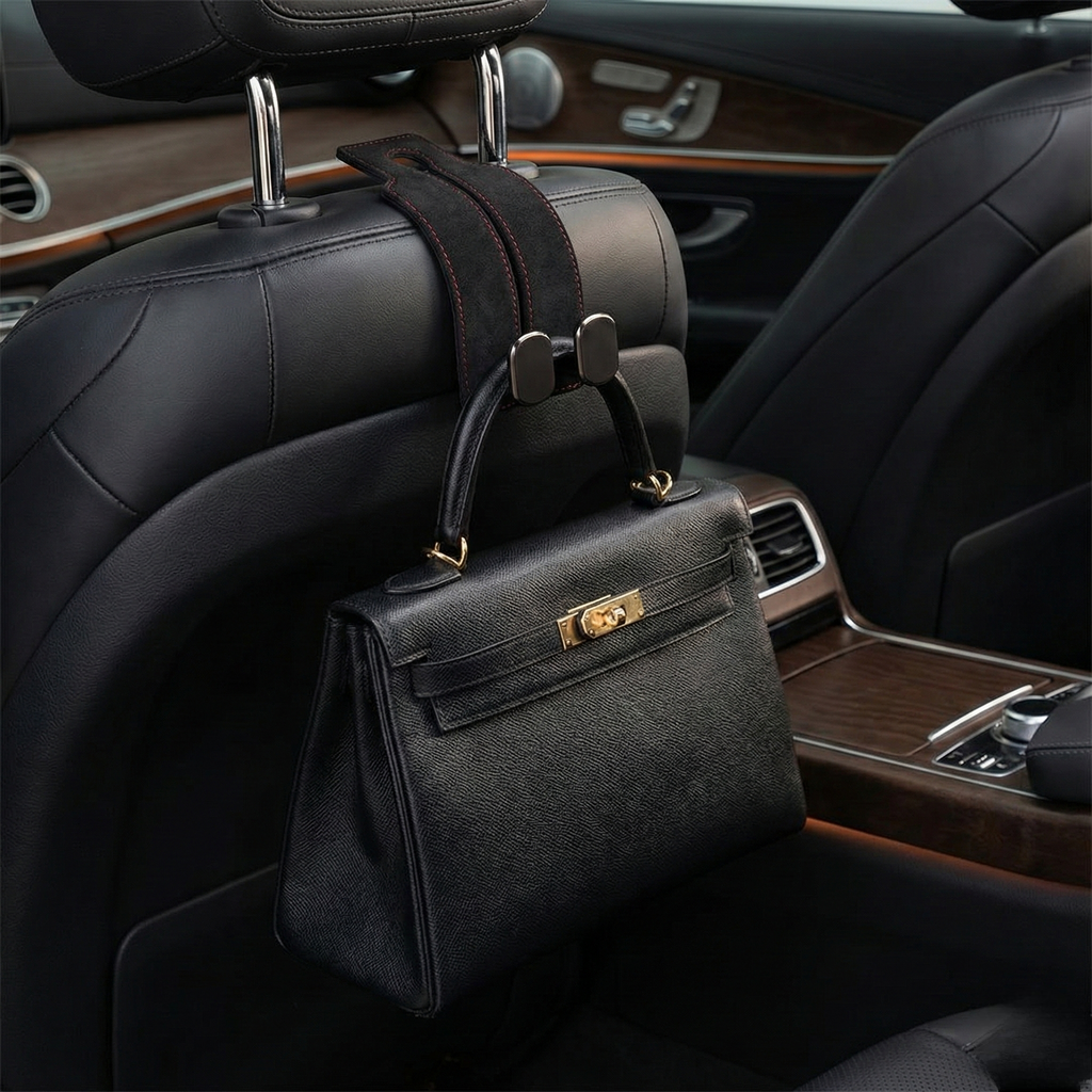 Insignia™ features a robust, electro-plated steel core that easily supports 30 lbs of weight. It is wrapped in hand-stitched PU leather that instantly elevates your interior aesthetic. The patented clip design ensures a rattle-free, firm hold on your headrest, keeping all your essential bags secure, organized, and off the floor.